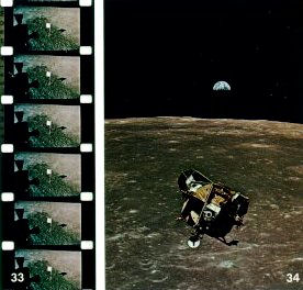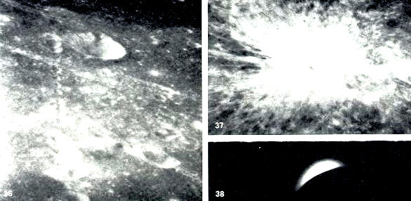 COLLINS This is Eagle (Photo 34), or perhaps half an Eagle would be better since the landing gear and lower part of the descent, stage, of course, remained on the surface. This was a very happy part of the flight for me. I, for the first time, really felt that we were going to carry this thing off at this stage of the game, and it looks like, although we were far from home, we were a lot closer to it than the pure distance might indicate. Neil made the initial maneuvers to get turned around, and then again I did the final docking. The probe is the dark bundle on the top of the LM and the docking target is below it and to the left in the lighter portion of the LM. As Buzz said, the rendezvous was absolutely beautiful. They came up from below -- as if they were riding on a rail. There was absolutely no disturbance or any off-nominal events during the last part of the rendezvous. Upper right you can see the RCS QUADS, and down below the various antenna and other protuberances. This gives you some idea of the rough surface available on the Moon. (Photo 35.) Of course, the maria on the front side are smoother than this, but in general the back side of the Moon is quite rough. I have a series of slides which, in the interest of time, I'm not going to dwell on, but I just like to point out that we did take a number of pictures, I believe, from Columbia. We took probably a thousand stills and some of them show very interesting surface features, various types of unusual craters, and some of them pose many riddles which we hope the geologists will, in time, be able to answer for us. That line of craters (Photo 36), for example, is difficult to explain; or at least without an argument it is. Here is a nearer crater with the white material having come from it. (Photo 37.) And this is a picture of the solar corona. (Photo 38.) Neil, would you like to close with that? |