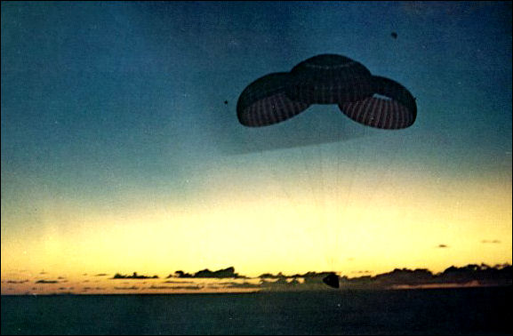 | Dawn was just breaking as Apollo 10 gently floated down into the Pacific 395 miles east of Pago Pago. The pinpoint landing was so accurate that the blinking tracking lights on the spacecraft were visible from the USS Princeton during the descent. |