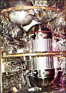 | Nestled amid crinkled metal foil used for thermal insulation, oxygen tank No. 2 was mounted above and close to a pair of hydrogen tanks in spacecraft bay. |