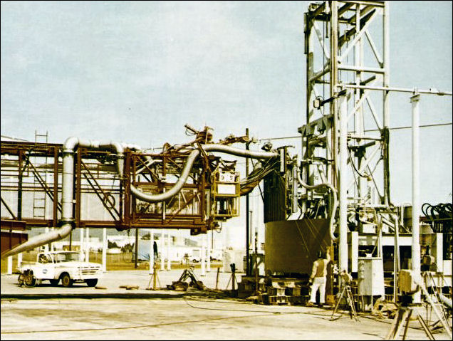 | A test at the "Arm Farm". Just to the man's left a skin section representing the S-11 stage is mounted to the Random Motion/Lift-Off Simulator, which can simulate at ground level the swaying of the space vehicle in a Florida storm. A duplicate of the Mobile Launch Tower's S-11 Forward Swingarm projects from the left, carrying the umbilicals that are connected to the skin section. |