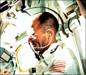 | Walt Cunningham, lunar module pilot on Apollo 7 (which carried no LM), makes notes while a spare film magazine floats weightlessly a few inches above his pen. To "park" something in space, it had to be left with zero motion. |