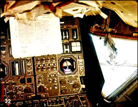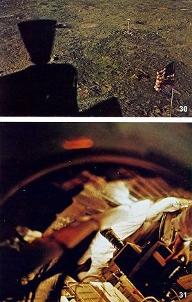 ARMSTRONG After reentering the LM, we could see the effects of our activity on the surface. (Photo 30.) You'll note that the surface looks considerably darker in the area where the majority of the walking took place. However, on the left side of the picture, where it is not as dark, there was also a good bit of walking. That indicates that the walking probably just increases your ability to notice the effects of the strange lighting that Buzz talked about earlier, where the cross-Sun lighting is a good bit darker than the down-Sun lighting. ALDRIN Following the EVA, we had a sleep period, which in a word, didn't go quite as well as we thought it might. We found it was quite difficult to keep warm. When we pulled the window shades over the windows, we found that the environment within the cabin chilled considerably and after about two or three hours, we found that it was rather difficult for us to sleep. You see mounted in the right hand window, the 16-millimeter camera (Photo 31), that was mounted for taking the pictures on the surface. Following the sleep period, as we're approaching the lift-off point we progressed with a gradual power-up of the lunar module, which included another star alignment check and as Mike came over in Columbia, one revolution before lift-off, we used the radar to track him as he went over. We continued the check out. You see here, one of the data books that's mounted up in front of the instrument panel (Photo 32), that was used to record the various messages that were sent up to us, a whole host of numbers, for the particular maneuvers that were coming up, that we would copy down. We would log these on that sort of a data sheet. |